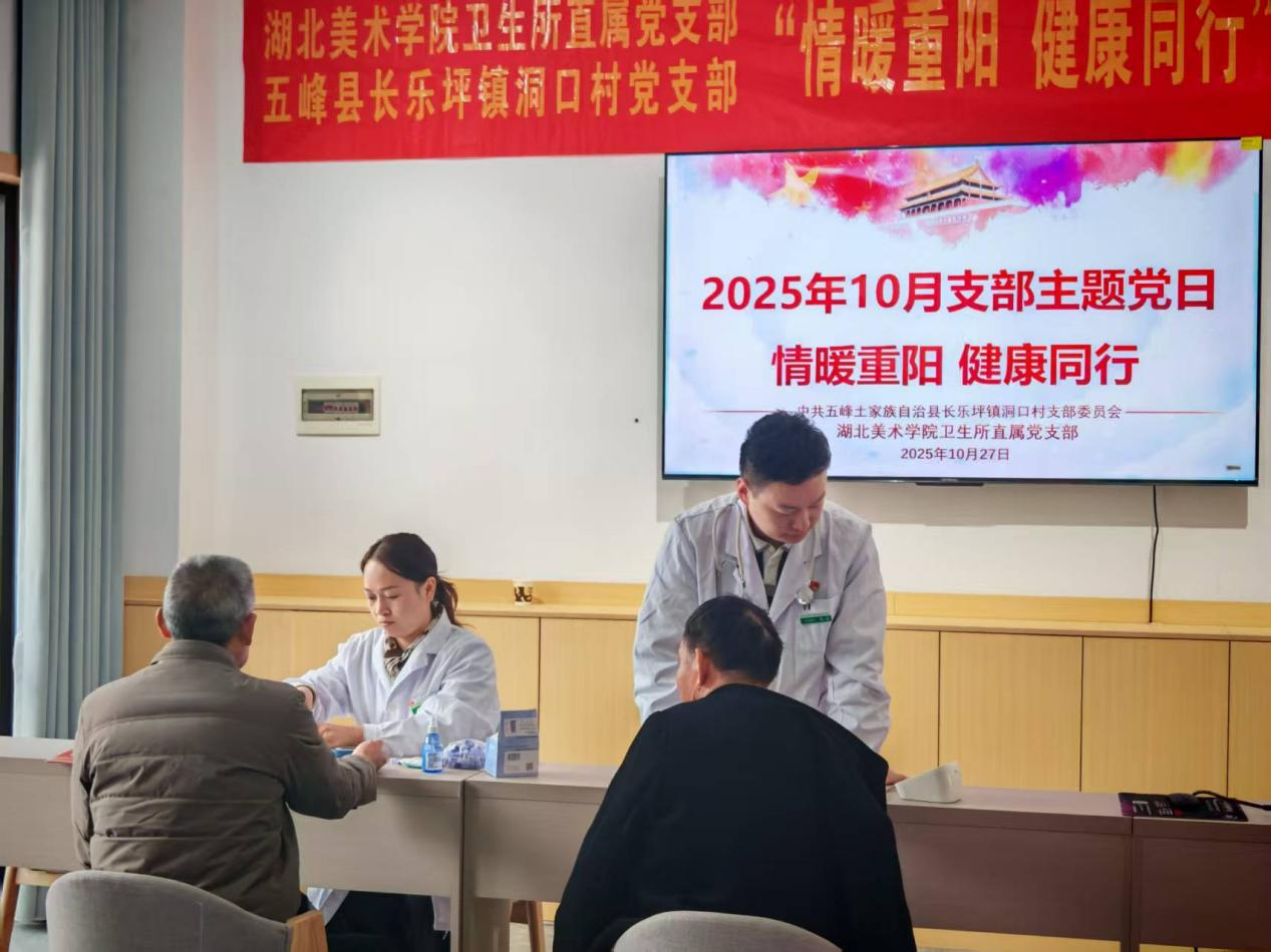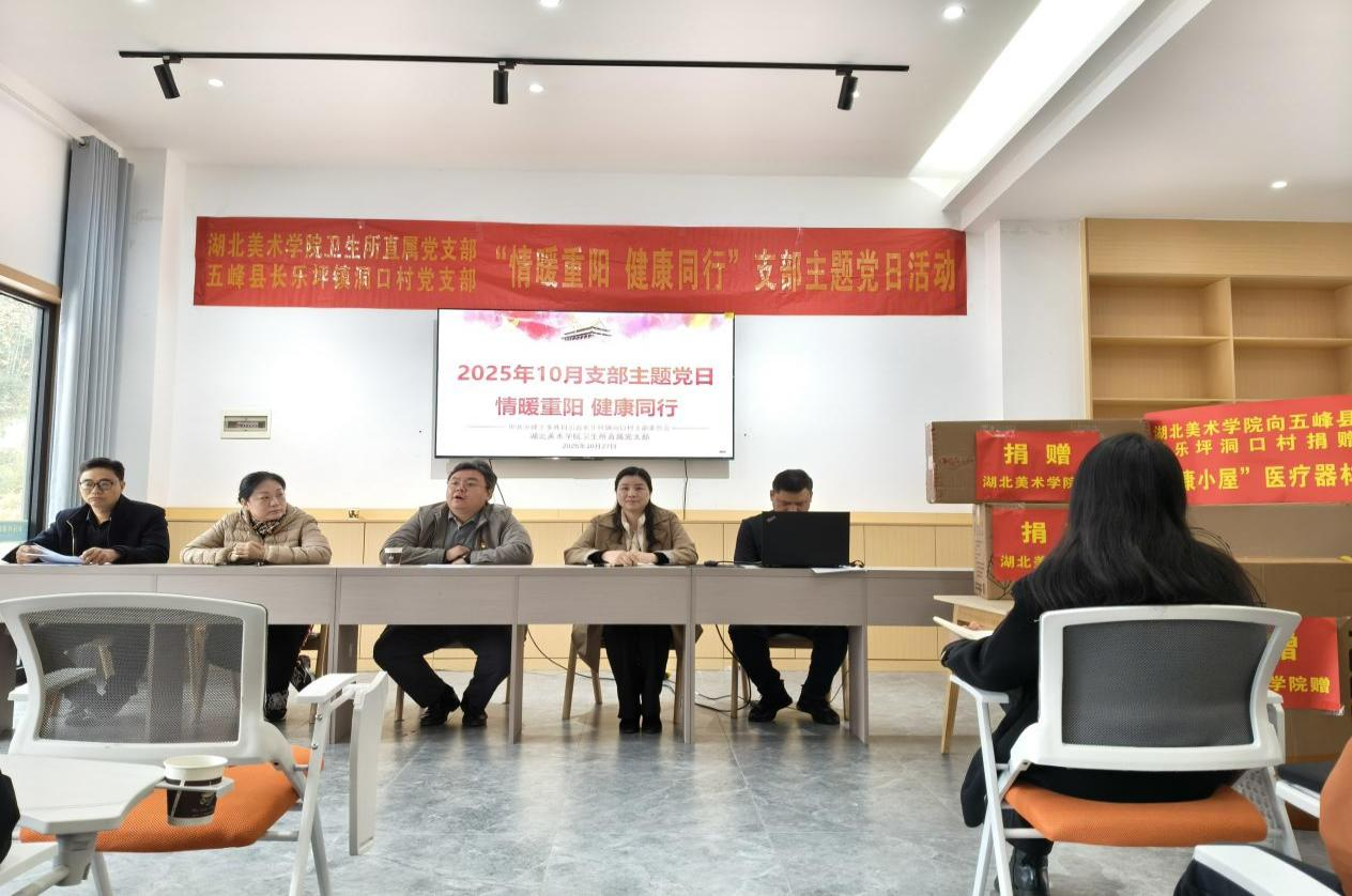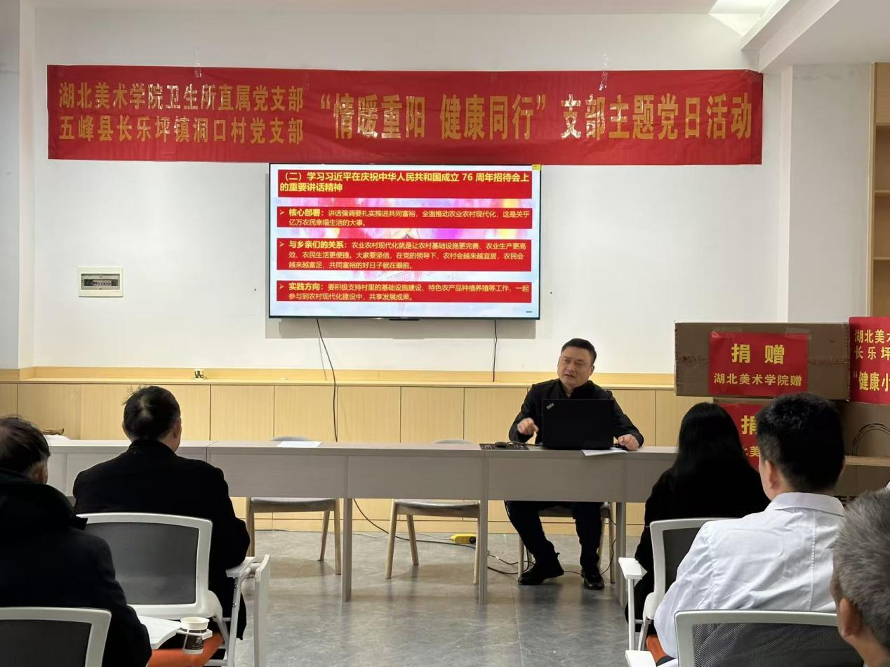 党员生活网消息:金秋送爽,丹桂飘香。10月27日上午,宜昌市五峰土家族自治县长乐坪镇洞口村新村委会大楼一楼会议室内暖意融融,湖北美术学院卫生所直属党支部与洞口村党支部在此联合开展“情暖重阳 健康同行”主题党日活动。镇领导、村“两委”、驻村工作队、湖北美术学院卫生所专家与老党员代表围坐一堂,一场融合物资捐赠、理论学习与健康服务的特色活动,让传统重阳佳节浸润着浓厚的党建温情。