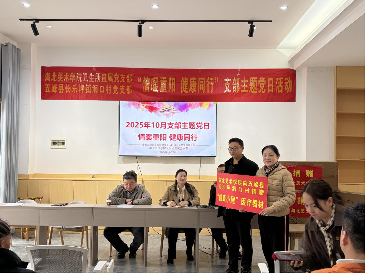 随后,在“健康小屋”捐赠仪式上,湖北美术学院卫生所所长陈捷将捐赠牌交予洞口村党支部书记张先军,一旁整齐陈列的血压计、血糖仪、轮椅等基础医疗设备,即将化身为守护村民健康的“贴身卫士”。“这些设备把‘微型卫生室’直接搬到了家门口,咱们老年人测血压、查血糖再也不用多跑路啦!”95岁的抗美援朝老党员陆先桥抚摸着崭新的血压计说。