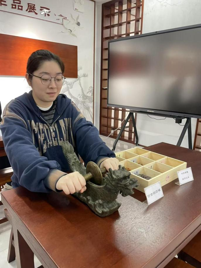 在中药馆非遗技艺体验区,党员教师们亲手操作仿古铜药碾等传统制药工具,沉浸式体验中药研磨与称取的全过程。指尖触感间,既感受着古法炮制技艺的精妙传承,更在实践中深化了对中药药性、剂量把控的专业理解,体悟到中医药传承中精益求精的工匠精神。