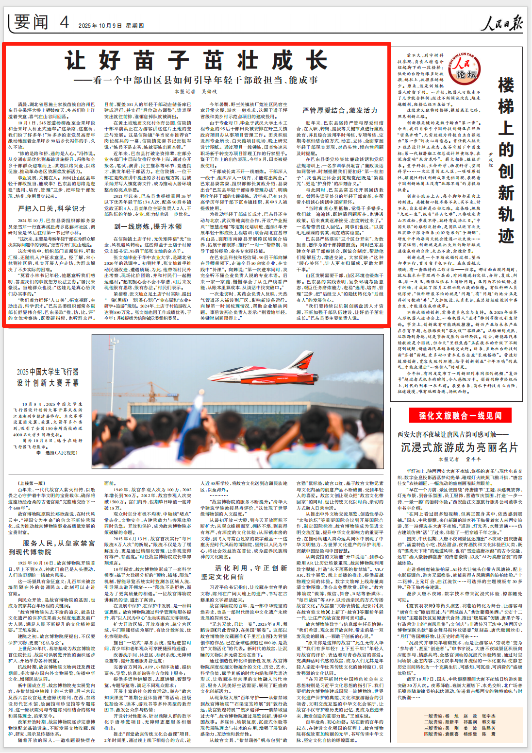今日(2025年10月9日)《人民日报》第4版刊发报道《让好苗子茁壮成长——看一个中部山区县如何引导年轻干部敢担当、能成事》。